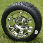 The Chrome STORM TROOPER golf cart wheels and tires combo is a rock solid upgrade for your golf cart and looks as great as it rides smooth. This 10″ Chrome wheel is wrapped up nicely with 205/65-10″ ComfortRide DOT approved tires that are great on all surfaces (grass, turf, & street). Just bolt them on and go!