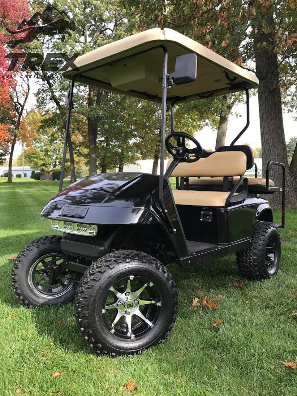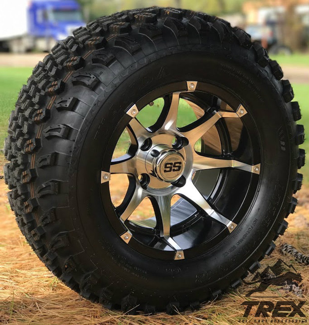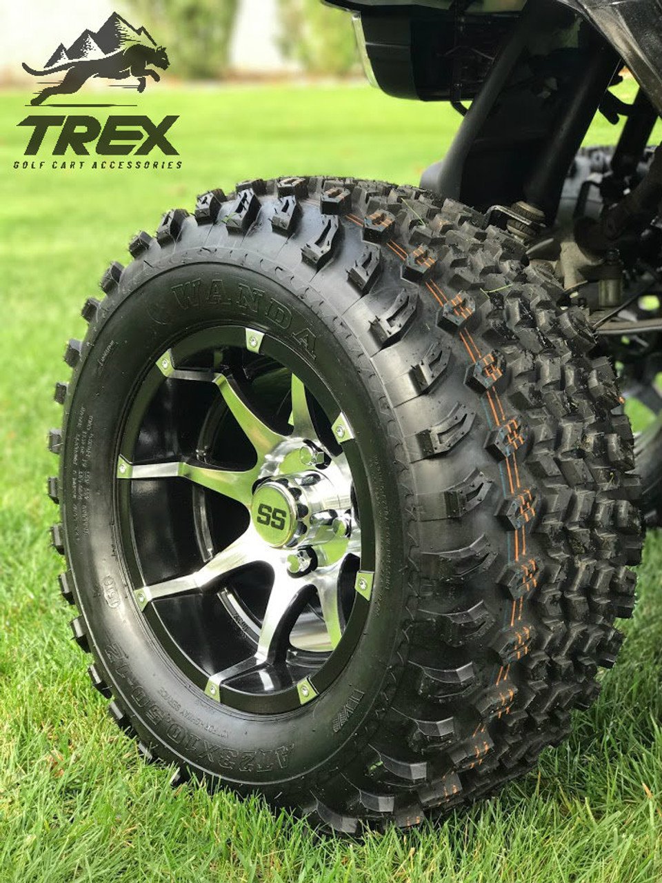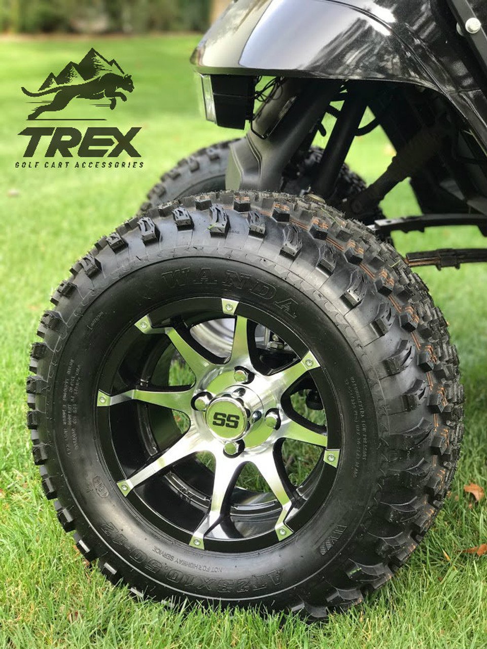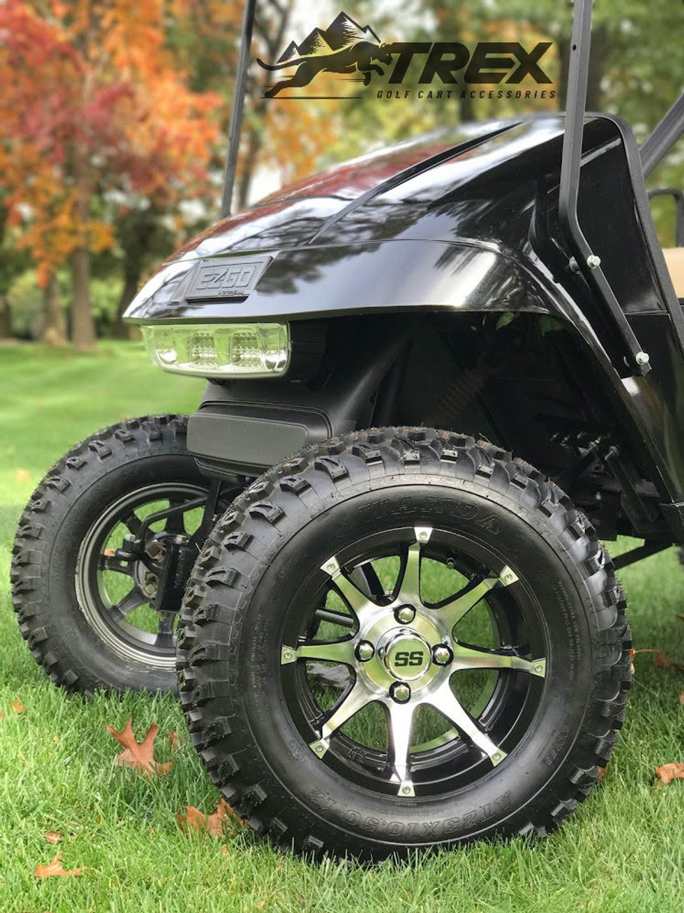 Make your golf cart stand out with this the all new 12″ BANSHEE wheel and tire kit for your lifted golf cart. Built TOUGH by high performance manufacturer TREX! The BANSHEE wheels are 12″x7″ in Gloss Black Aluminum / Machined color and come wrapped up in high performance 23×10.5-12″ All Terrain tires.Â