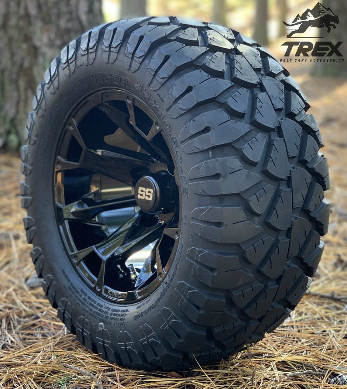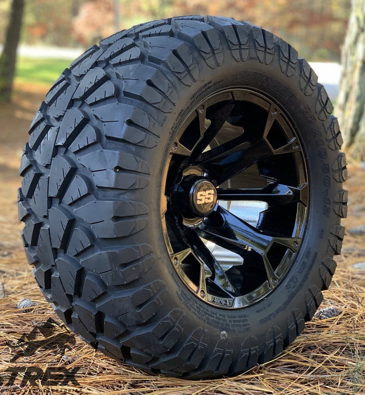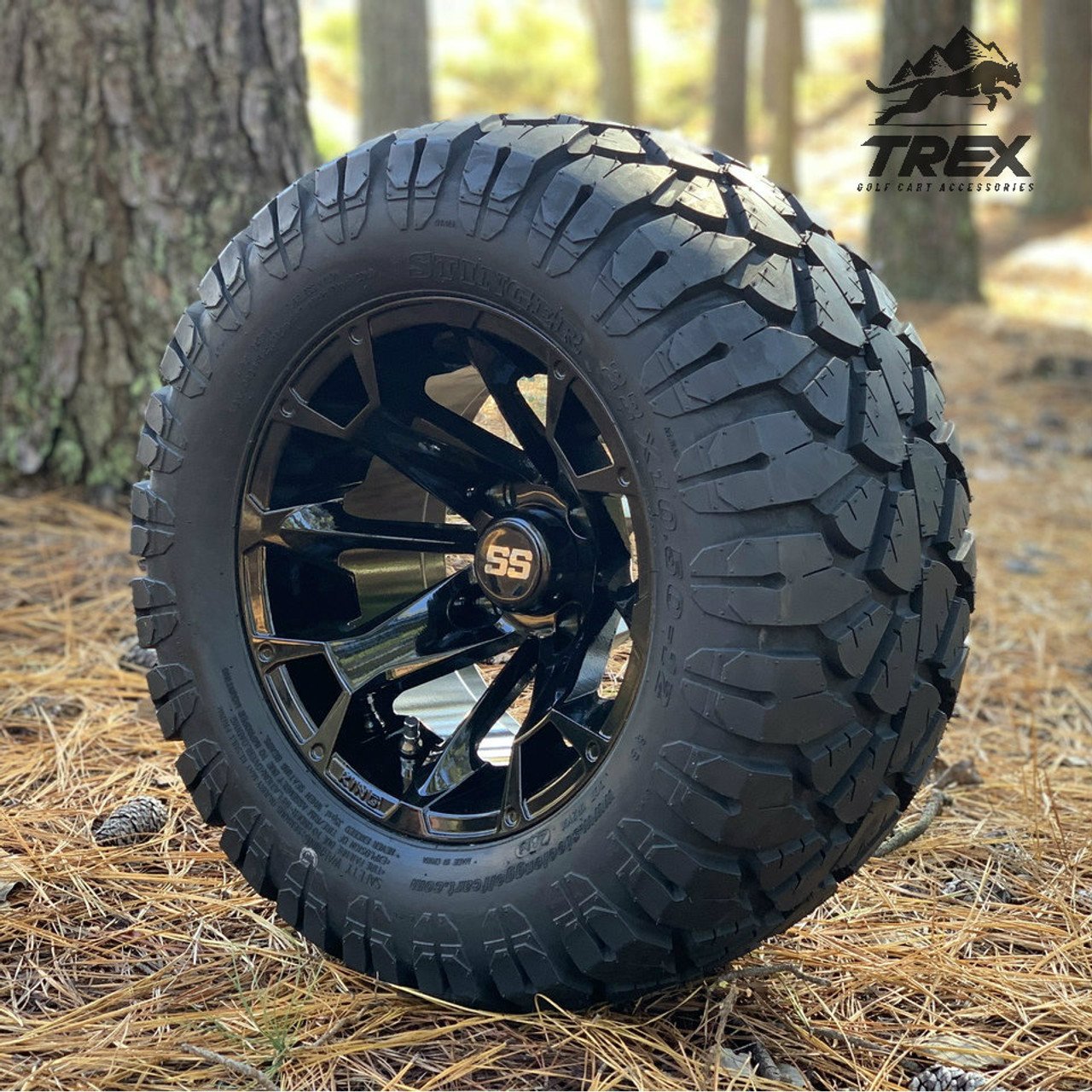 We’re kicking it up a notch by mounting the amazing TREX 12″ BLACKJACK wheels on our brand new STINGER 23″ All Terrain tires! WOW. Give your golf cart the look of a $100,000 truck with this amazing Blacked Out combo wheel & tire set for your lifted golf cart.