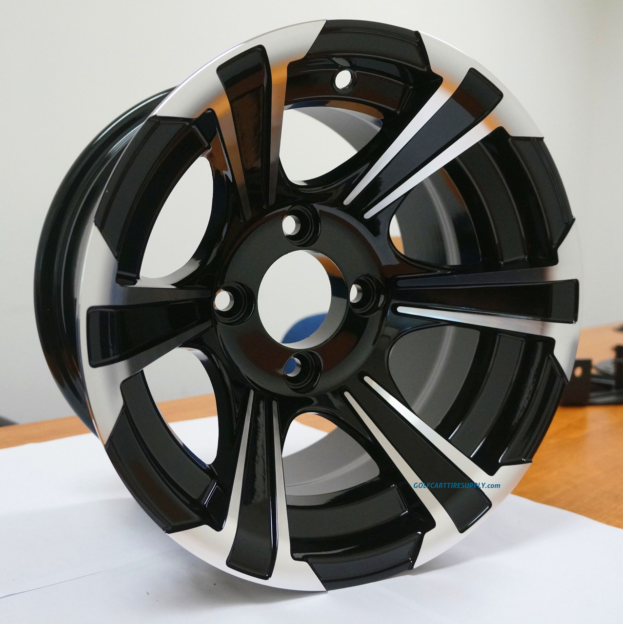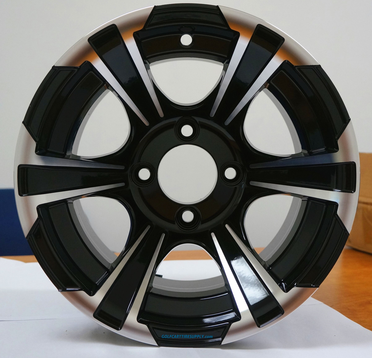 - (4) 12×7″ BLADE Black/Machined Aluminum golf cart wheels