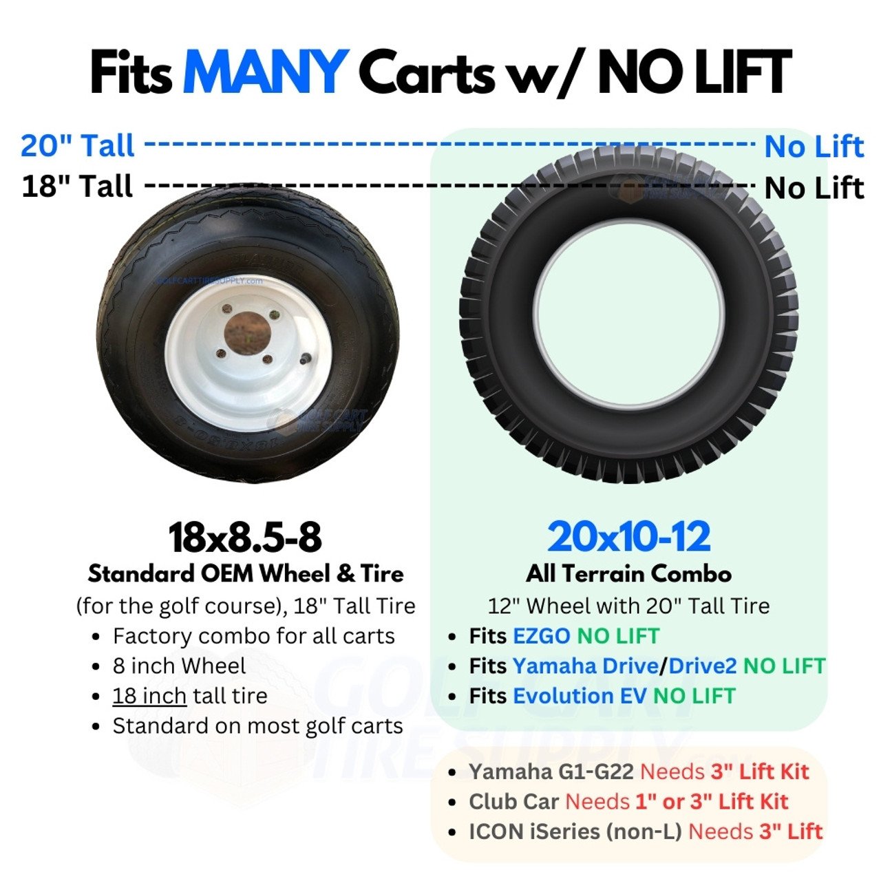 | Will Need Small Lift Kit (1″ to 3″): | Club Car: DS/ Precedent/ Onward/ Tempo | Yamaha: G-Series (G1-G22) |