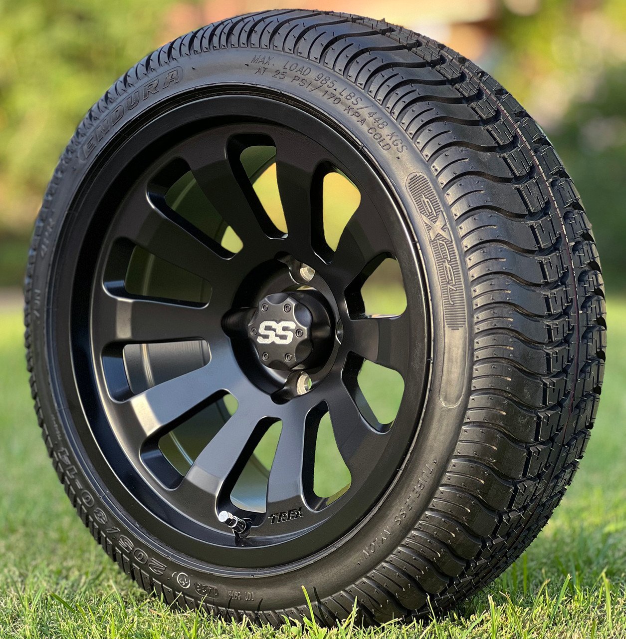 The 14″ ORION Matte Black wheel and tire set fits all golf carts and includes: