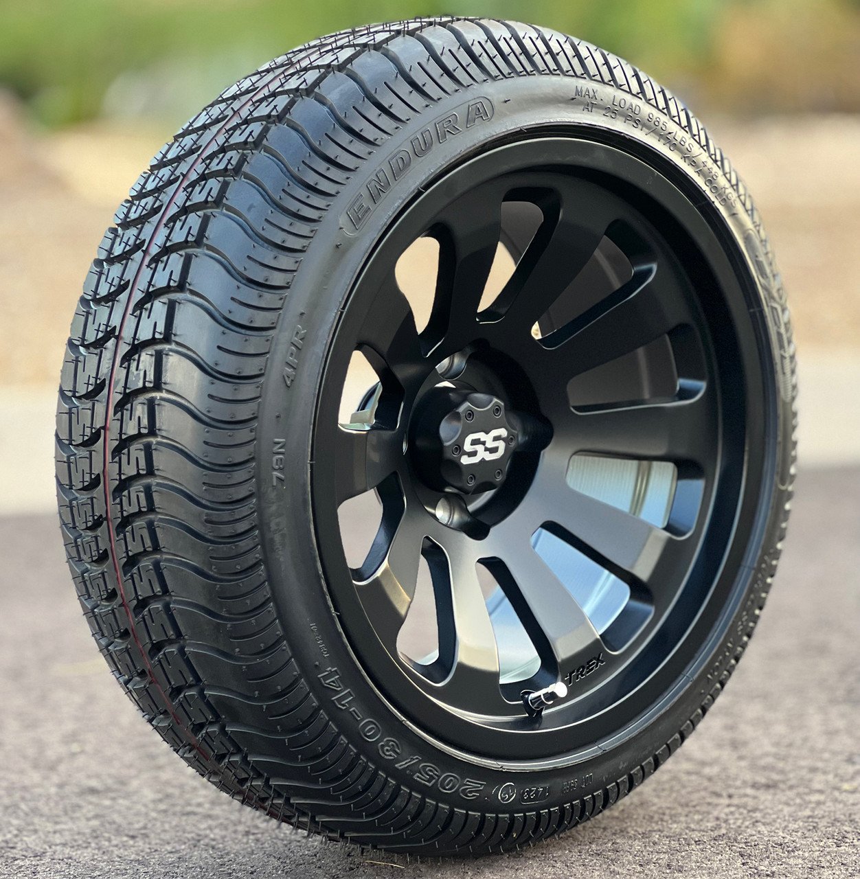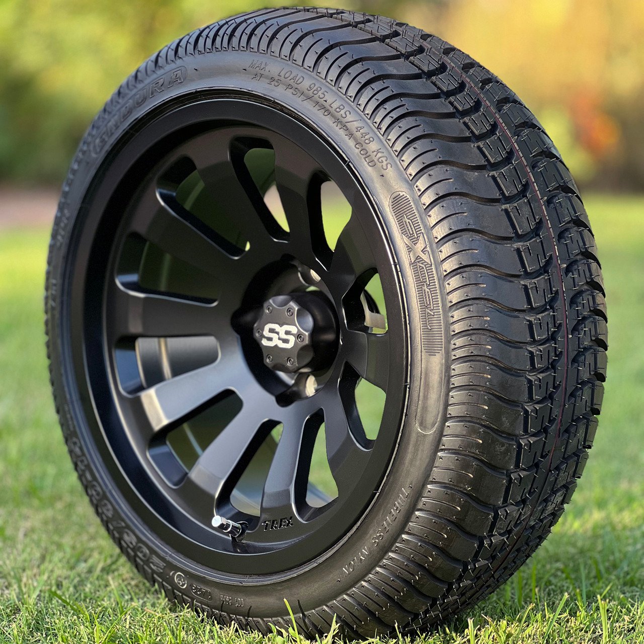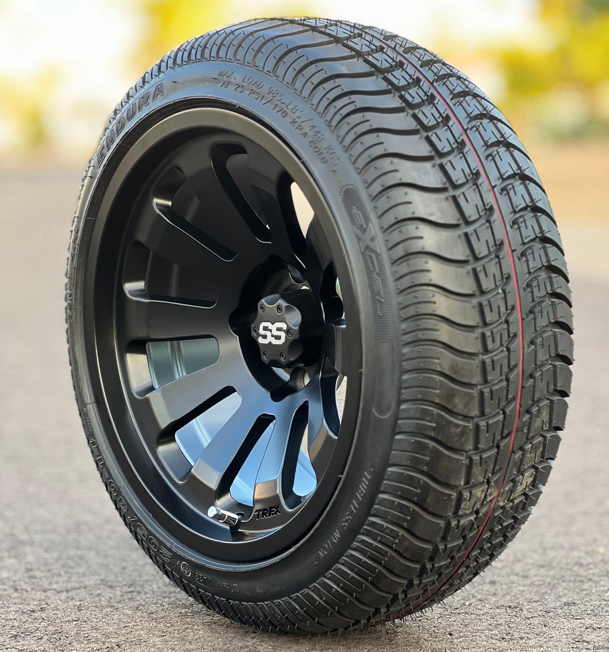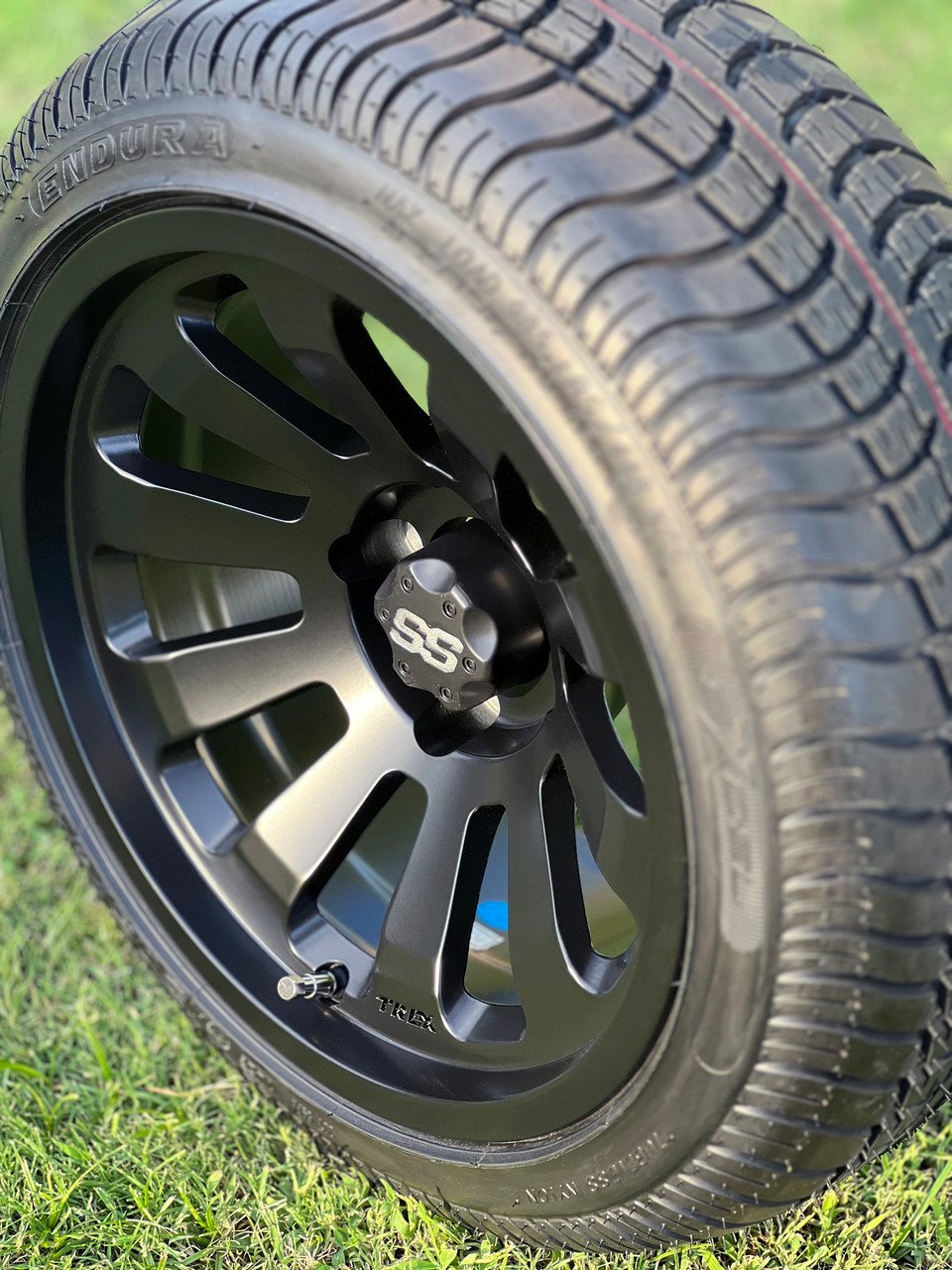 The 14″ ORION Matte Black golf cart wheels are ridiculously good looking. And if you are looking for a fresh and killer style no one else has, the ORION golf cart wheels from TREX are for you! This combo comes mounted on 205/30-14 DOT Low Profile (DOT approved) and and turf safe tires for a winning combination on the streets and the golf course. With a fully sport off-road inspired design, but clean modern finish, the ORION comes painted in brilliant Matte Black paint that brings up the intensity of any cart they are installed on. And as always, they are built to withstand the test of the elements and are easy to clean too.
