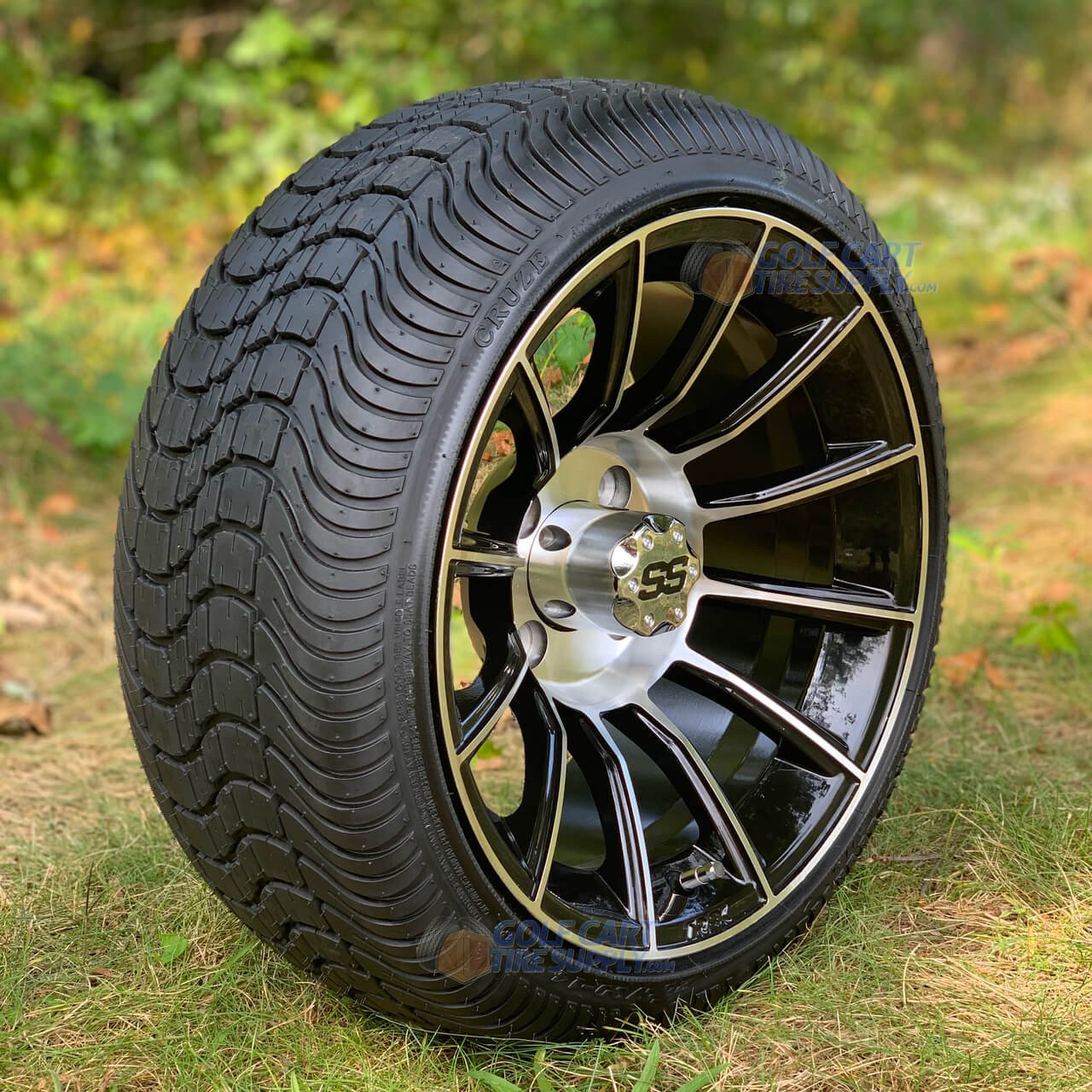 The TITAN Machined/Black Aluminum wheels will give your golf cart that totally custom and sporty look, and breathe new life into your cart! Built to withstand the test of the elements, and easy to clean! We wrap up the wheels in 205/30-14″ Low Profile DOT approved and turf safe tires for a winning combination on the streets and the golf course.
