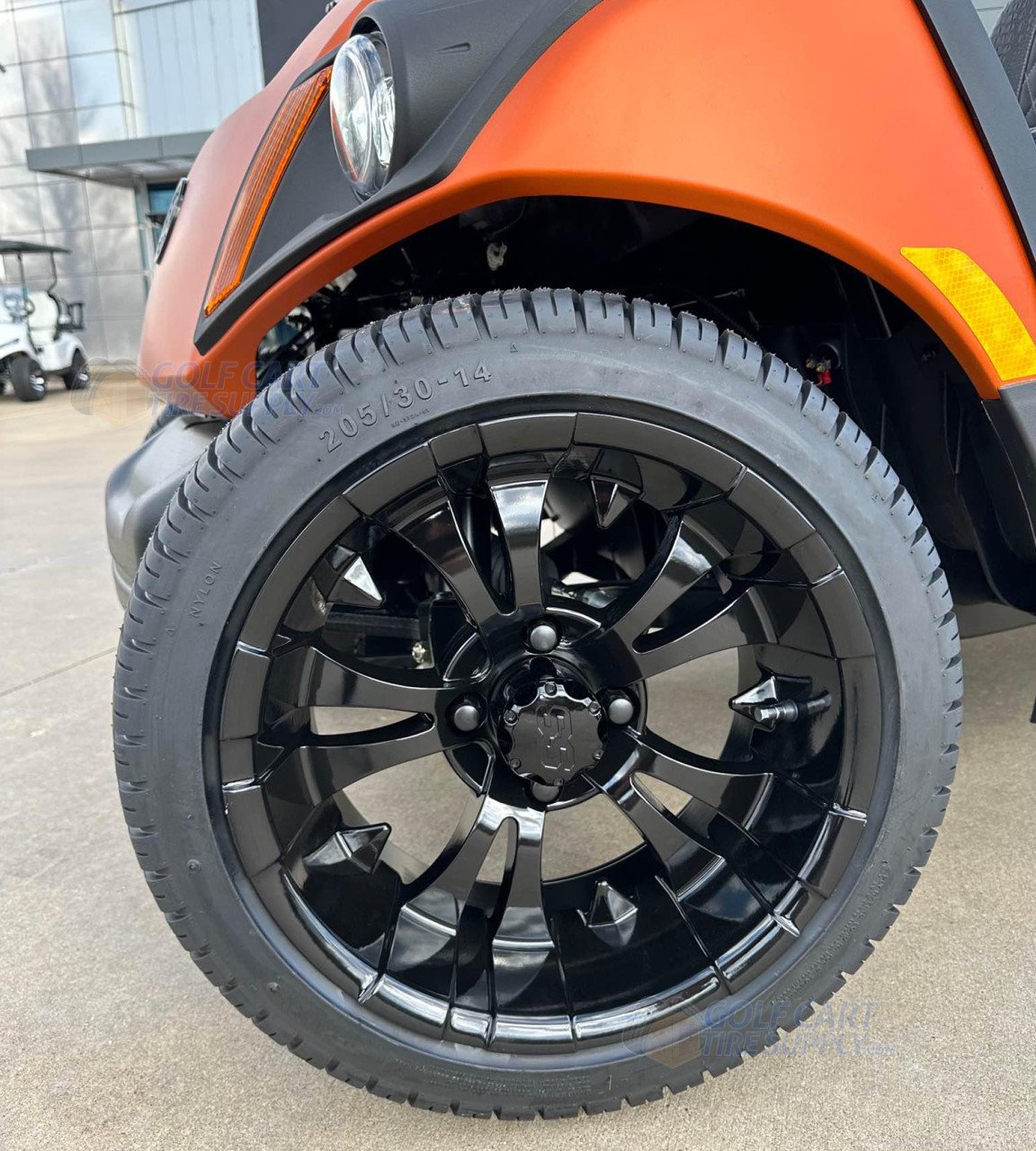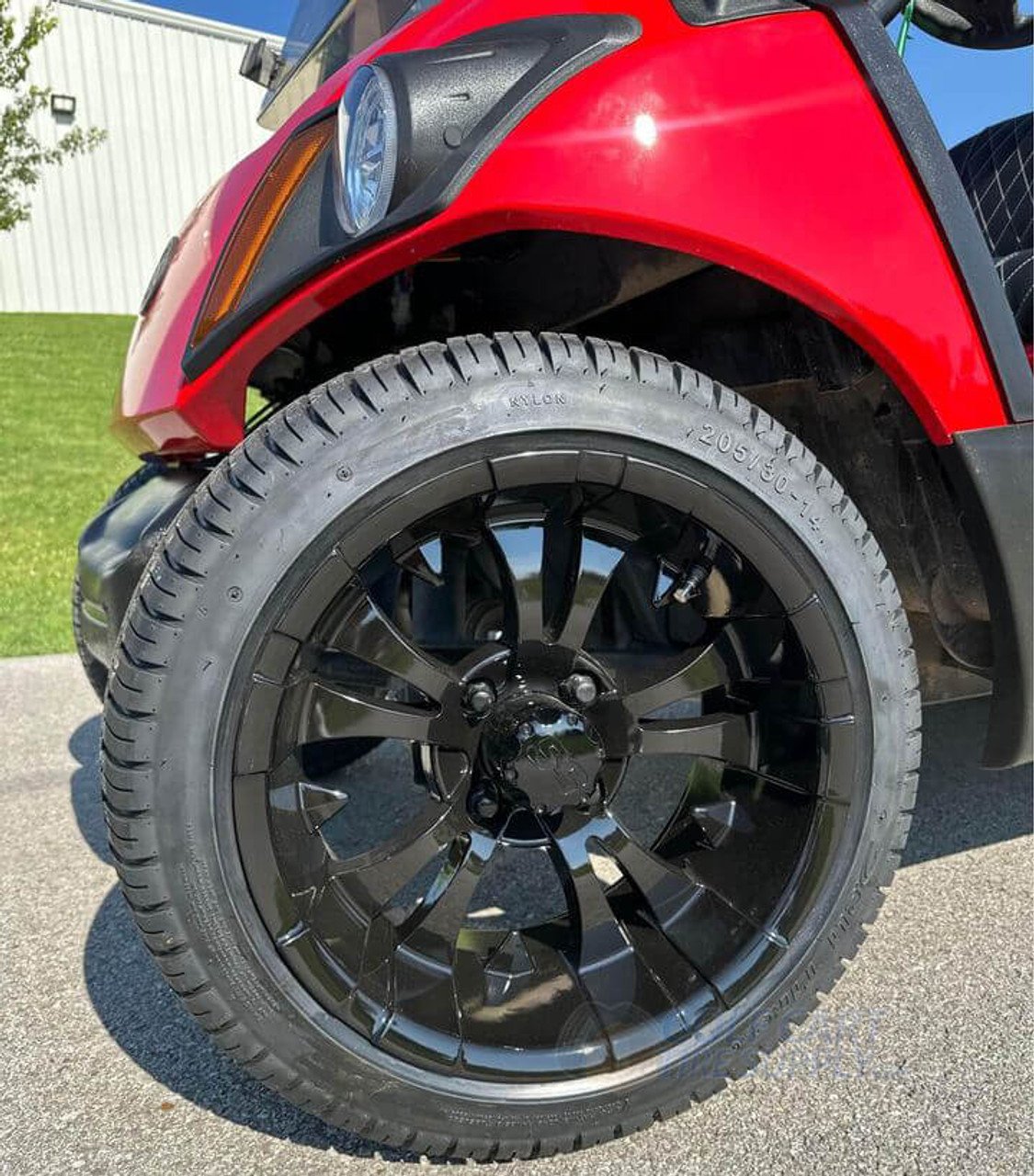Sporty and mean: The VAMPIRE Gloss Black wheel and tire combo is everything you could possibly want in a high performing wheel and tire combo. Our VAMPIRE wheels are as tough as nails and come finished in a high-end gloss black. We wrap the VAMPIRE GLOSS BLACK combo up in fresh 205/30-14″ DOT approved and turf safe low profile tires that are perfect for both the street and the golf course.