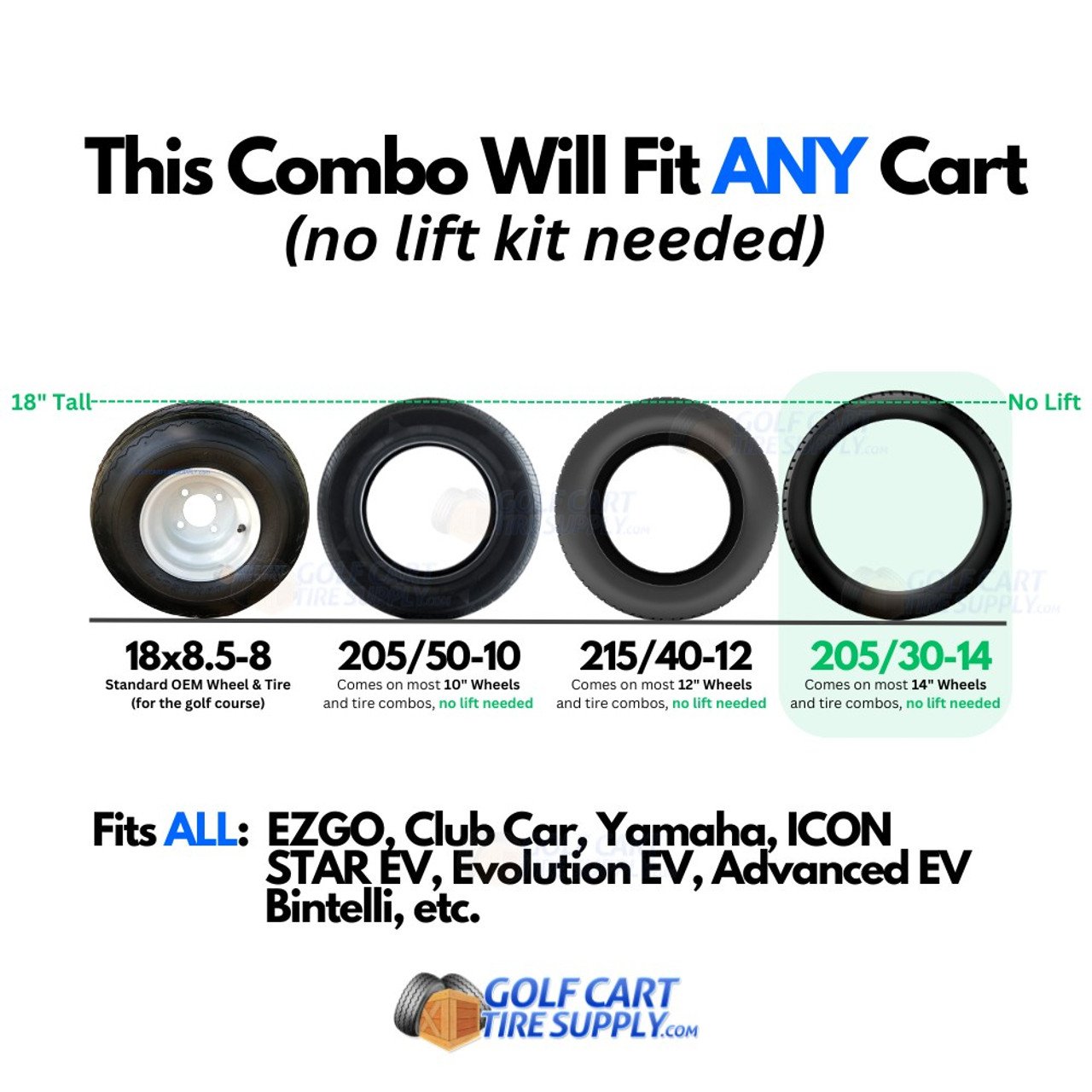 This wheel and tire kit fits all EZGO Marathon, Medalist, TXT, RXV, ST, PDS models and Yamaha Drive (G29) / Drive2 models without the need for any lift kit.