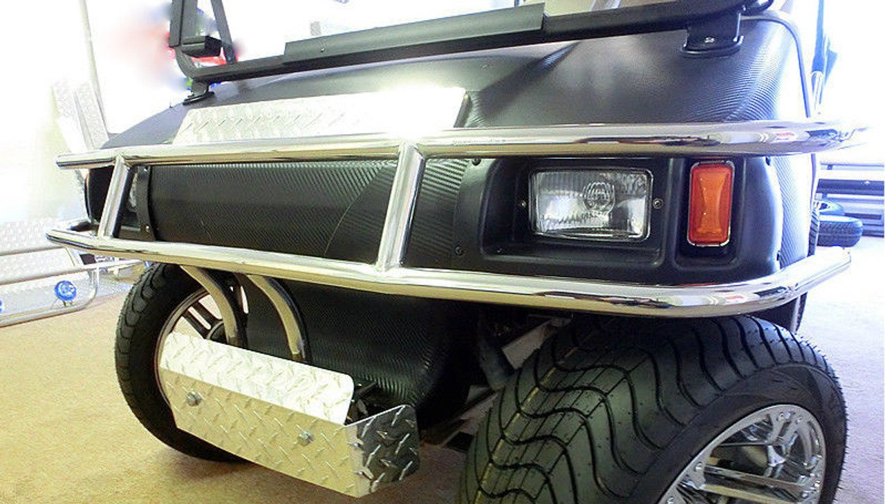 Beef up the front end of your Club Car DS model golf cart with this TOUGH and high-quality Stainless Steel brush guard from Steel Engineering. This golf cart brush guard will give your Club Car golf cart added rigidity and incredible protection when cruising through the brush. On top of it all, it will make your cart look amazing!