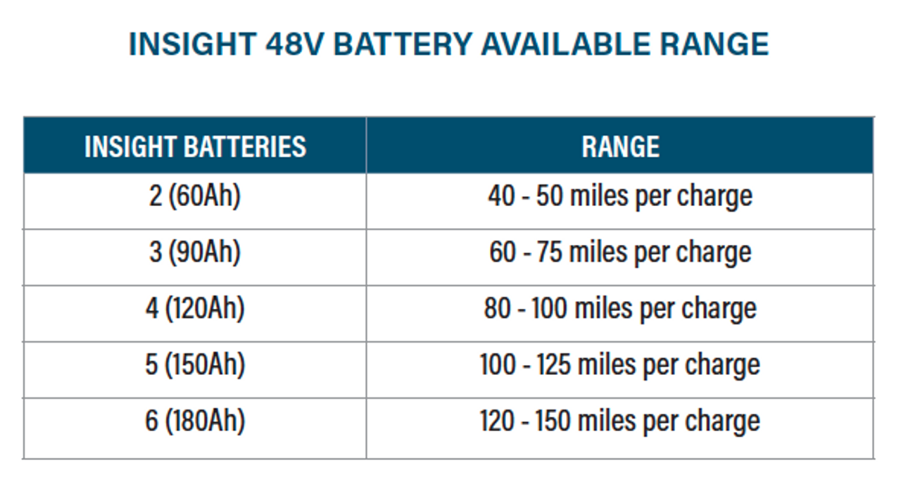 150Ah (5 Batteries): 100-125 Miles per charge.