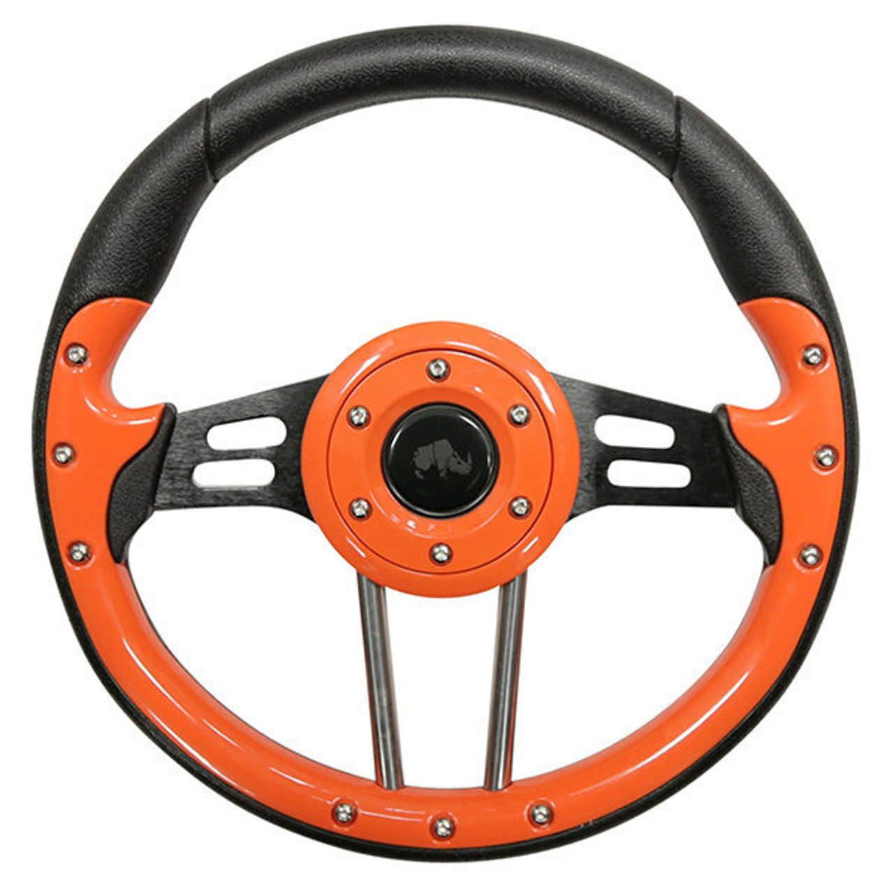 This RHOX high performance Orange/Black steering wheel is an easy way to upgrade both the look and feel of driving your golf cart. The ergonomically designed hand grips feel much more comfortable than stock EZ-GO golf cart steering wheel grips.