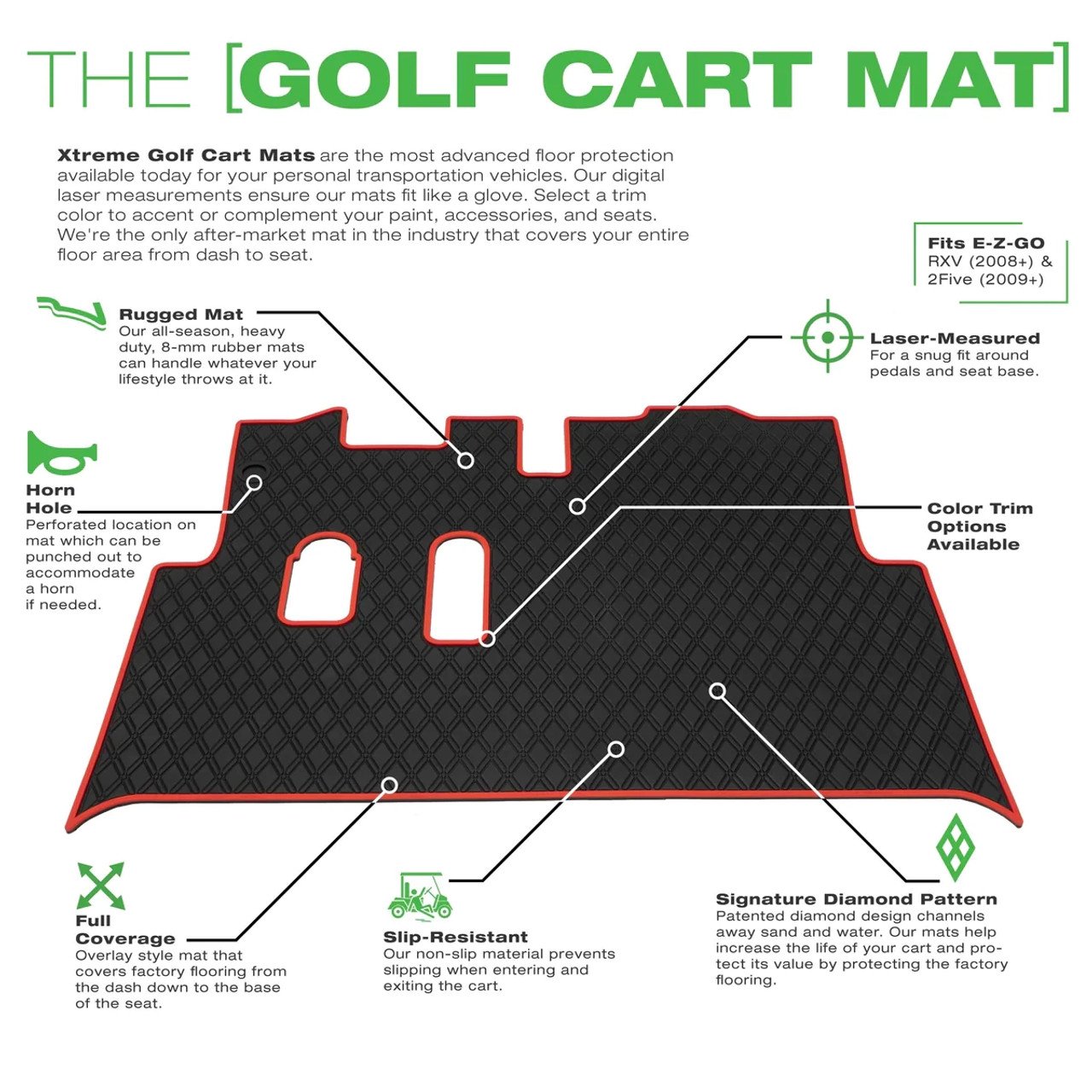 XTREME mats feature beautiful diamond pattern stitching that will upgrade the look of even the oldest golf cart out there. This high-quality, waterproof floor mat covers your original floorboards on ANY/ALL EZGO RXV / 2Five golf cart (2008+), gas or electric. The mats are custom molded to fit perfectly on your EZGO RXV golf cart and provide great wet/dry grip for you and your passengers at all times (especially when getting in and out of the cart).