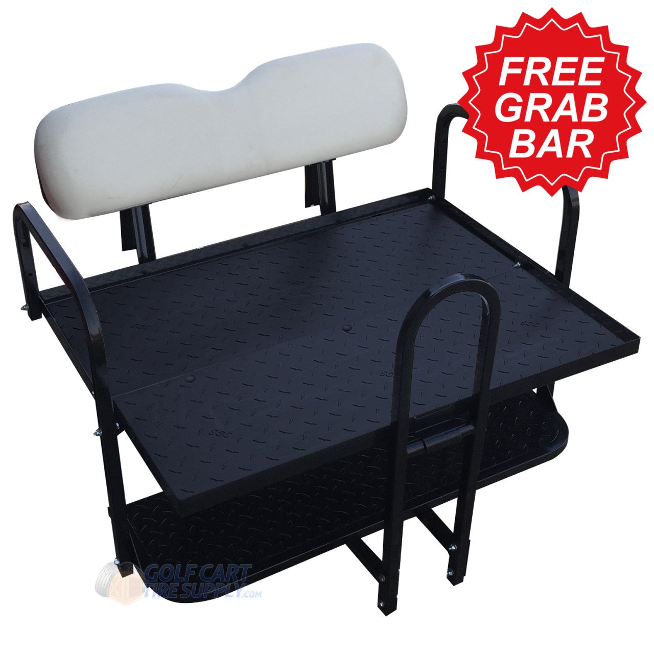 EZGO TXT/ Medalist/ PDS Golf Cart Rear Seat Kit – Factory WHITE (matches OEM seat color) – Flip Seat w/ Cargo Bed & FREE Grab Bar