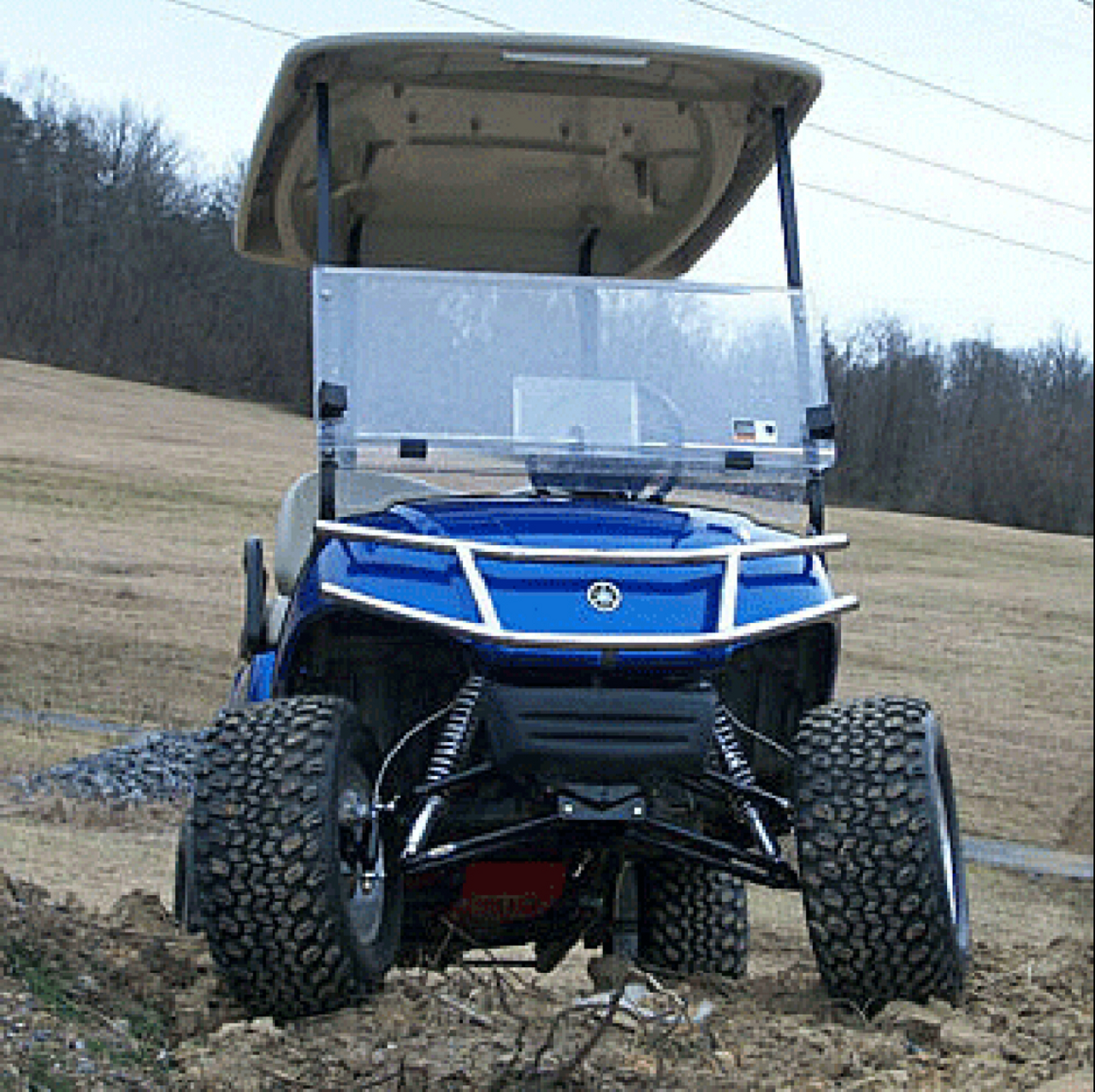 Not only does it change your cart’s appearance, but it also makes your cart fully functional. This lift kit features an Independent Front Suspension, which turns your Golf Cart in to a “crawler” that can “walk” across extreme terrain, rocky surfaces, and almost anything in its path. As this Lift Kit features an Independent Front Suspension, it also provides an unparalleled smooth ride on the road, grass, and trails. Front shocks independently absorb movement unlike a standard Golf Cart’s factory axle which is usually made from IRON that does not bend, or flex. –