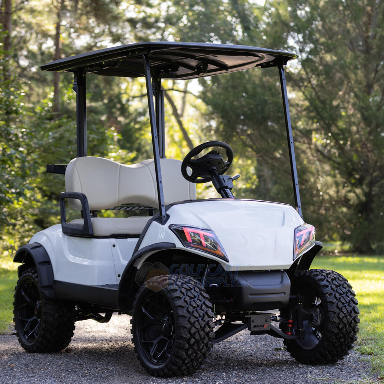 The 4″ King XD lift kit series from MadJax provides a tough, reliable and comfortable way to lift your Yamaha Drive-2 golf cart. The Kingpin design used on this lift kit replaces the traditional Heim joint style, providing a more simple (and failsafe) lift.