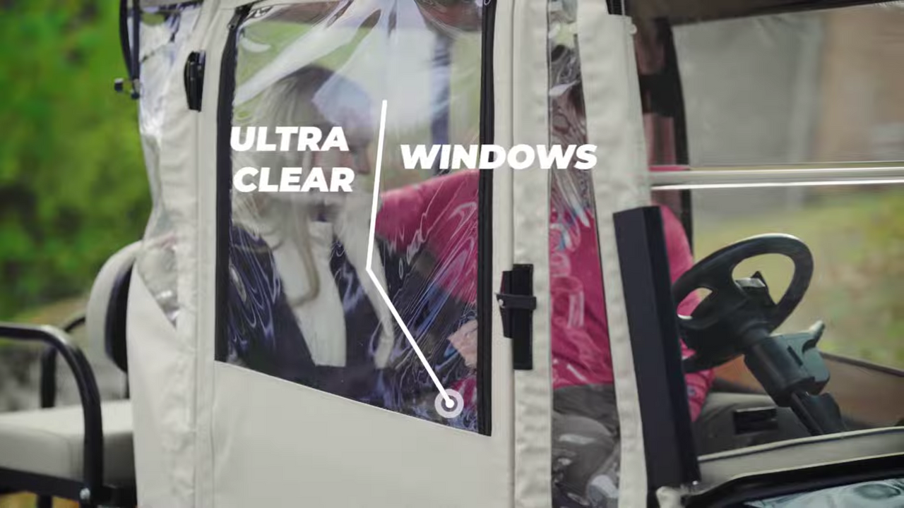 Have an Extended 80″ Roof 4 Passenger Golf Cart? Checkout our 4 Passenger Hinged Door Enclosures.